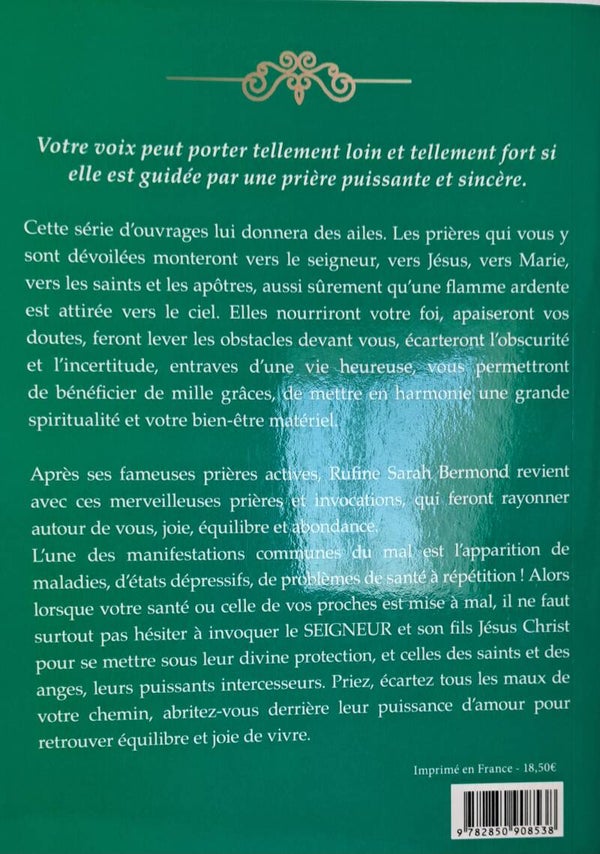 Après ses fameuses prières actives, Rufine Sarah Bermond revient avec ces merveilleuses prières et invocations, qui feront rayonner autour de vous, joie, équilibre et abondance L'une des manifestations communes du mal rest T'apparition de maladies, d'états dépressifs, de problèmes de santé à répétition ! Alors lorsque votre santé ou celle de vos proches est mise à mal, il ne faut surtout pas hésiter à invoquer le SEIGNEUR et son fils Jésus Christ pour se mettre sous leur divine protection, et celles des saints et des anges, leurs puissants intercesseurs. Priez, écartez tous les maux de votre chemin, abritez-vous derrière leur puissance d'amour pour retrouver équilibre et joie de vivre.